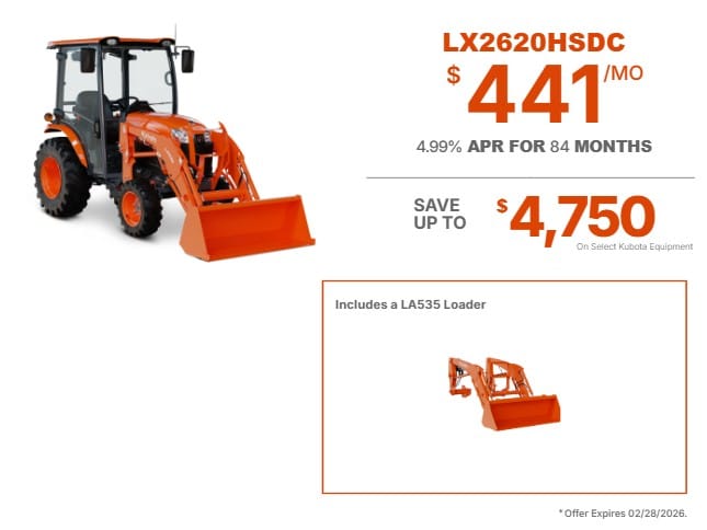 DISCLAIMER Monthly payment shown is based on no money down with 4.99% APR for 84 months. Insurance is included in the estimate; however, taxes and applicable fees are not included and may vary based on individual circumstances. Financing is subject to approved credit. Offer valid on in-stock units only. Promotion expires 2/28/2026, but is subject to change without notice. For complete details, visit your local dealer or KubotaUSA.
